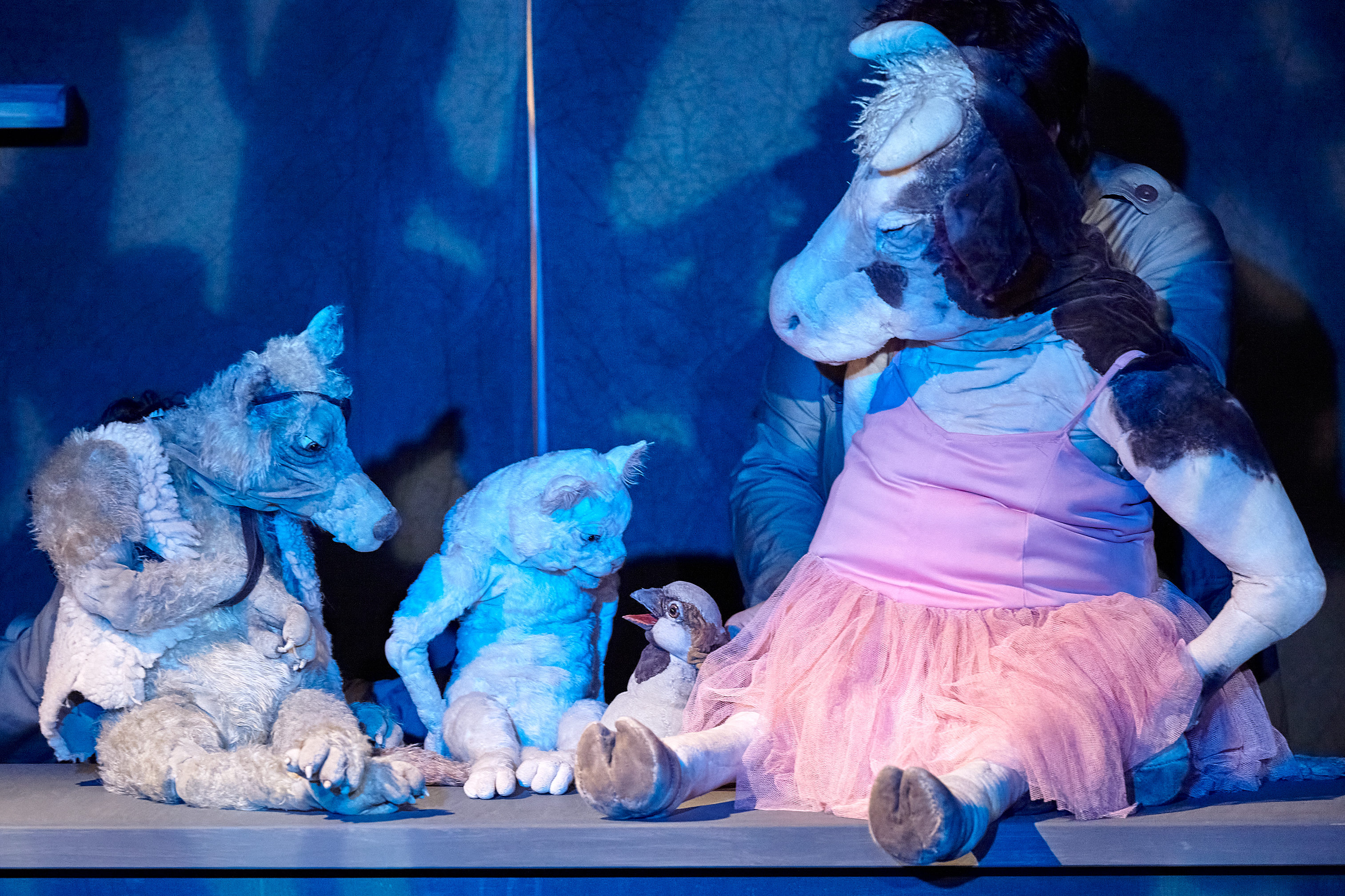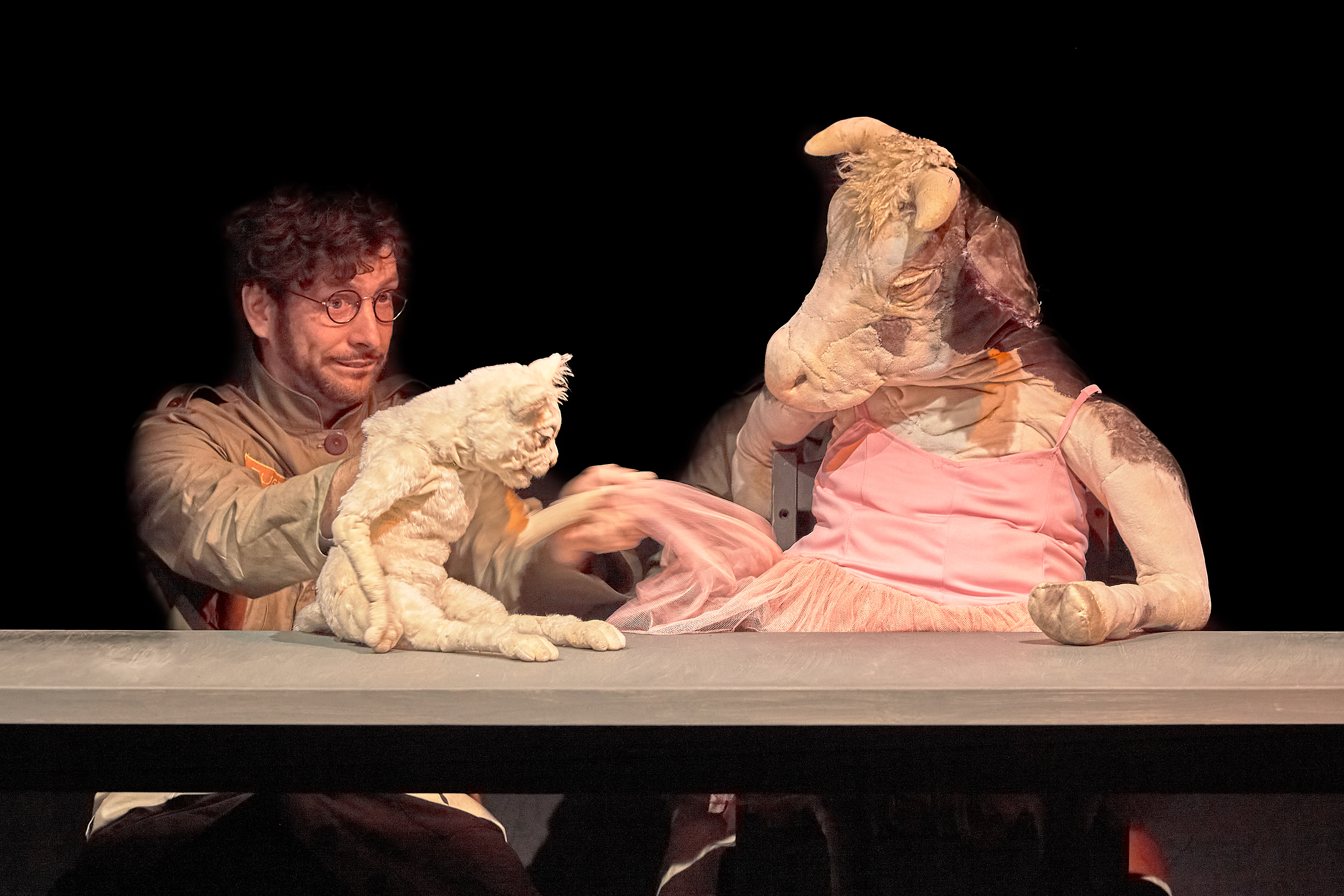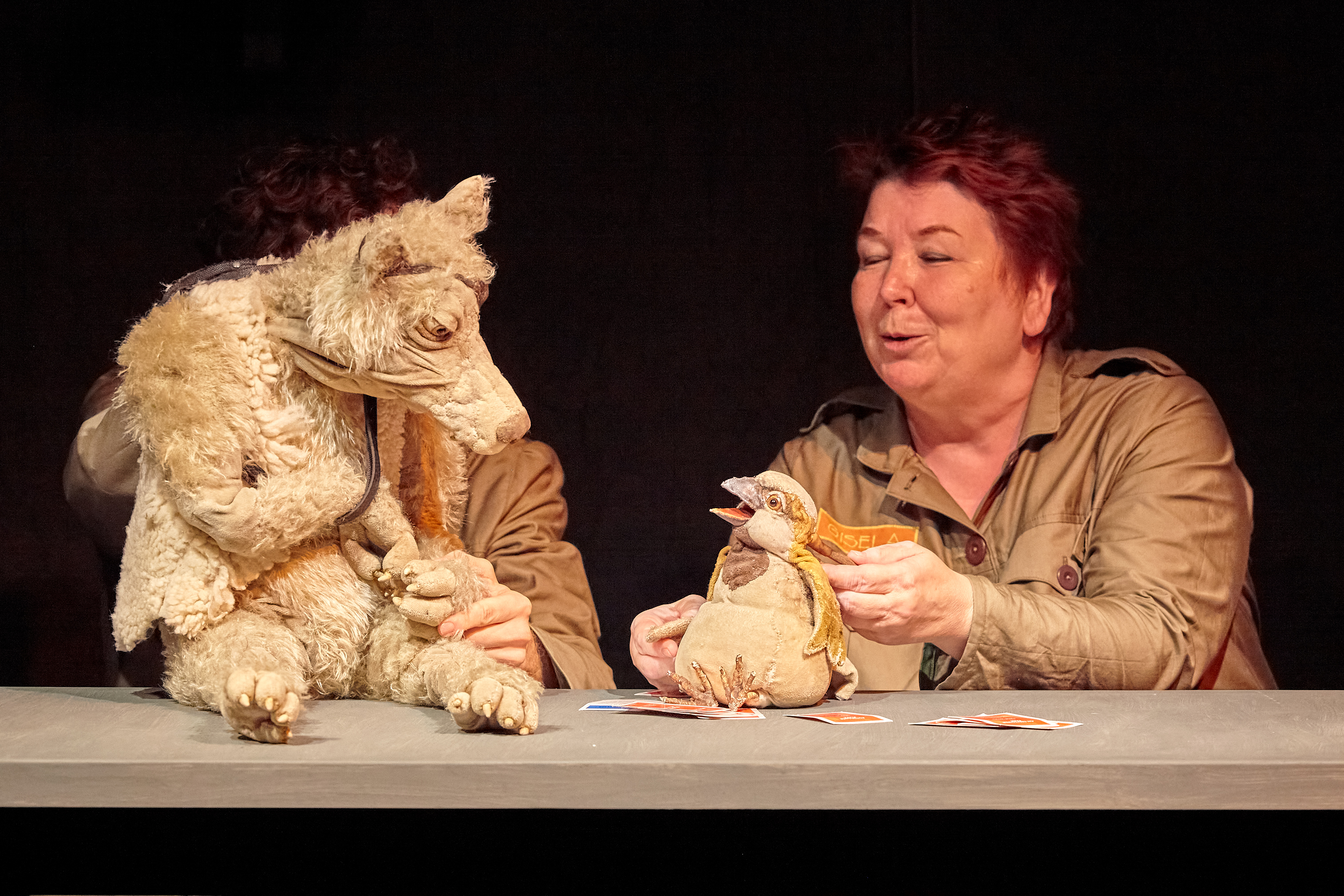 Regina und Daniel Wagner führen die lebendig und markant gestalteten Handpuppen, bringen sie in unterschiedlichen Tonlagen zum Sprechen, verleihen ihnen jeweils einen ausgeprägten Charakter, so dass die Puppenspieler, obwohl sie nie ganz hinter ihren Figuren verschwinden, doch unsichtbar erscheinen. Da ist der gutgläubige Spatz, die wehrhafte Kuh, die zur Musik von „Schwanensee“ ein graziles Tänzchen auf dem Tisch hinlegt, die Katze, die die anderen und manchmal auch sich selbst schwindelig quasselt, so dass sie ihren Kumpanen empfiehlt: „Hört nicht auf mich“. Am stärksten und anrührendsten ist aber der alte, schon etwas lädierte und vom Leben gezeichnete Wolf, der keiner Fliege was zu Leide tut. Wenn er Peter Gabriels „The Book of Love“ anstimmt, dann schmelzen nicht nur seine Freunde dahin.