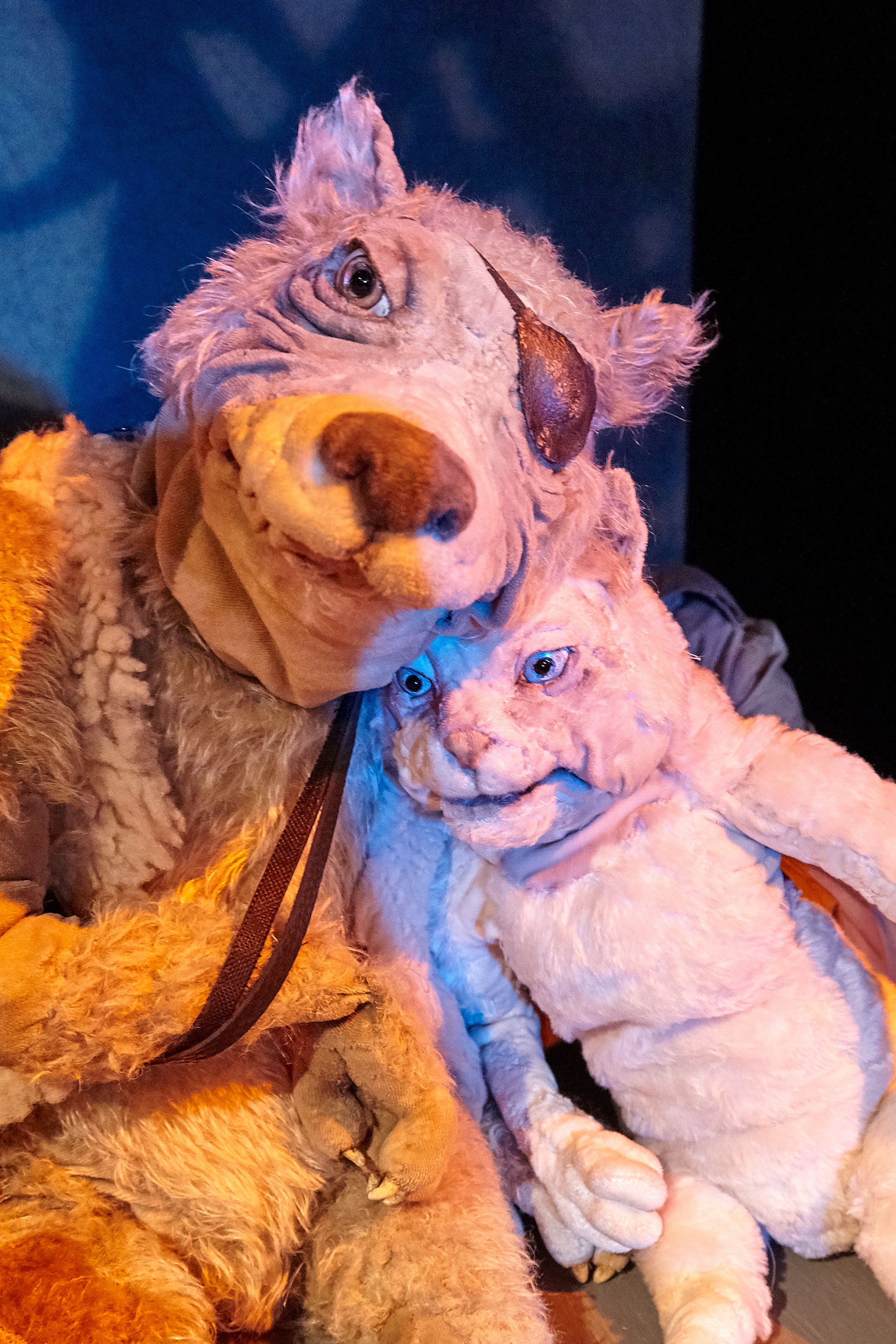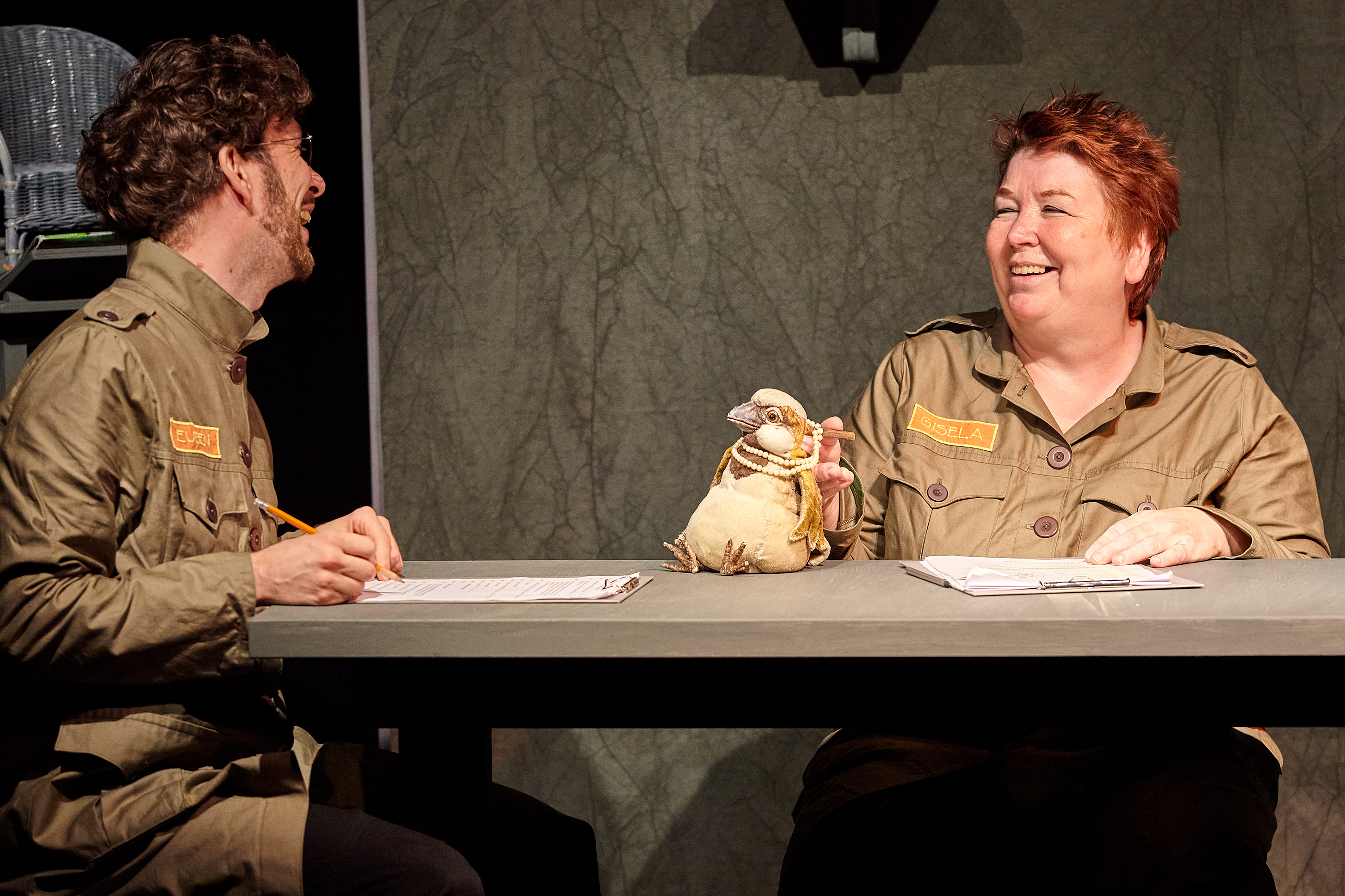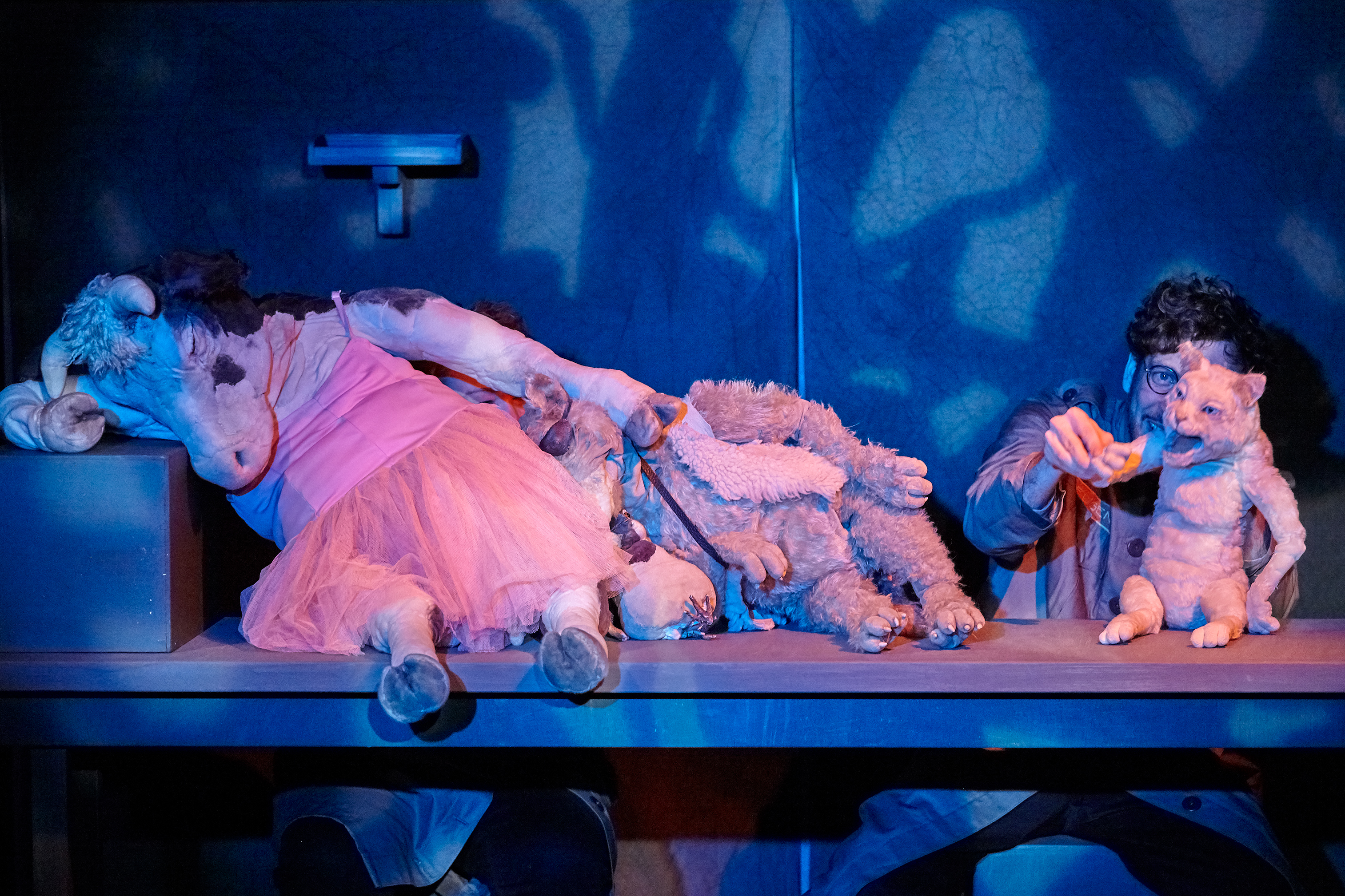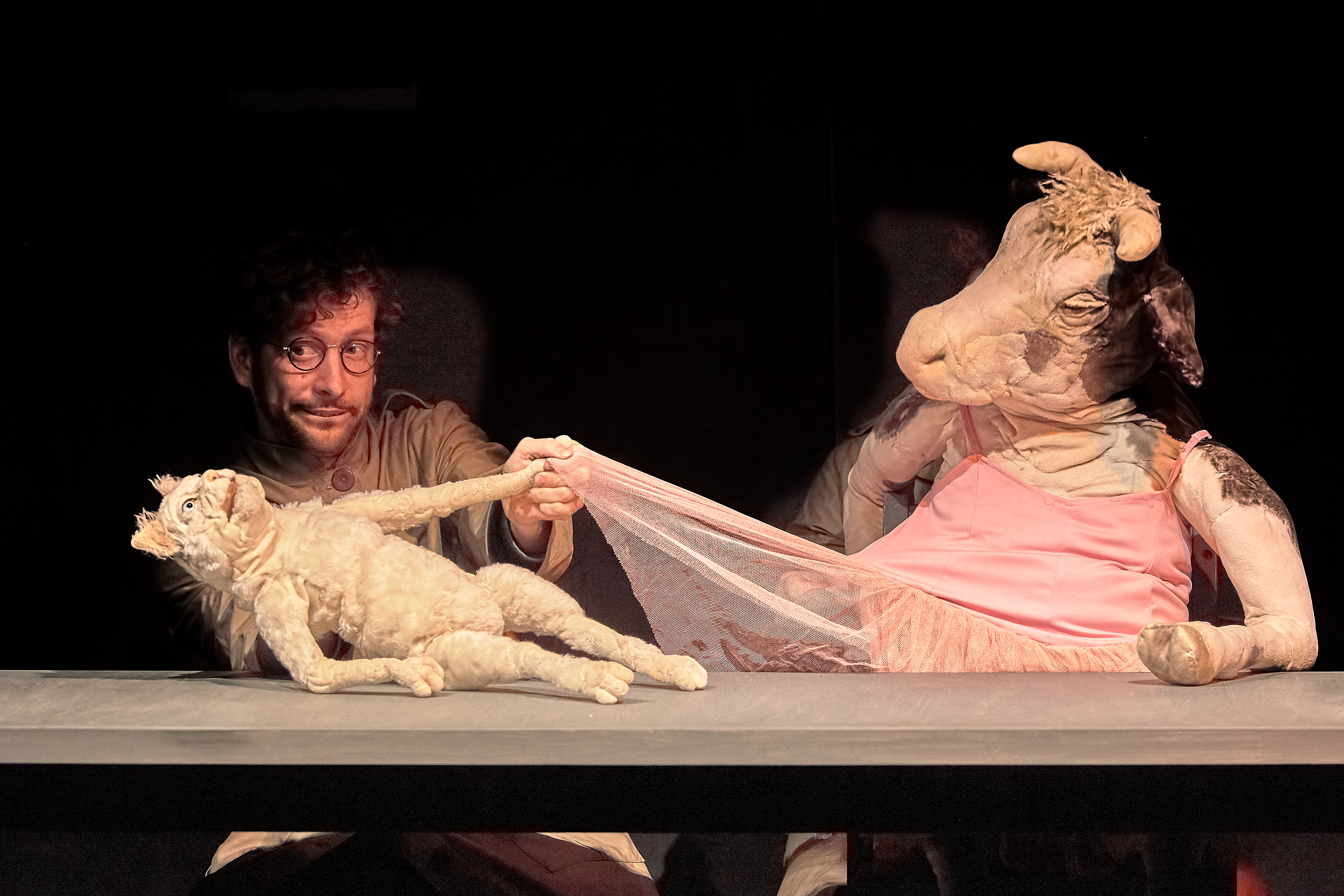 Regina und Daniel Wagner führen die lebendig und markant gestalteten Handpuppen, bringen sie in unterschiedlichen Tonlagen zum Sprechen, verleihen ihnen jeweils einen ausgeprägten Charakter, so dass die Puppenspieler, obwohl sie nie ganz hinter ihren Figuren verschwinden, doch unsichtbar erscheinen. Da ist der gutgläubige Spatz, die wehrhafte Kuh, die zur Musik von „Schwanensee“ ein graziles Tänzchen auf dem Tisch hinlegt, die Katze, die die anderen und manchmal auch sich selbst schwindelig quasselt, so dass sie ihren Kumpanen empfiehlt: „Hört nicht auf mich“. Am stärksten und anrührendsten ist aber der alte, schon etwas lädierte und vom Leben gezeichnete Wolf, der keiner Fliege was zu Leide tut. Wenn er Peter Gabriels „The Book of Love“ anstimmt, dann schmelzen nicht nur seine Freunde dahin.