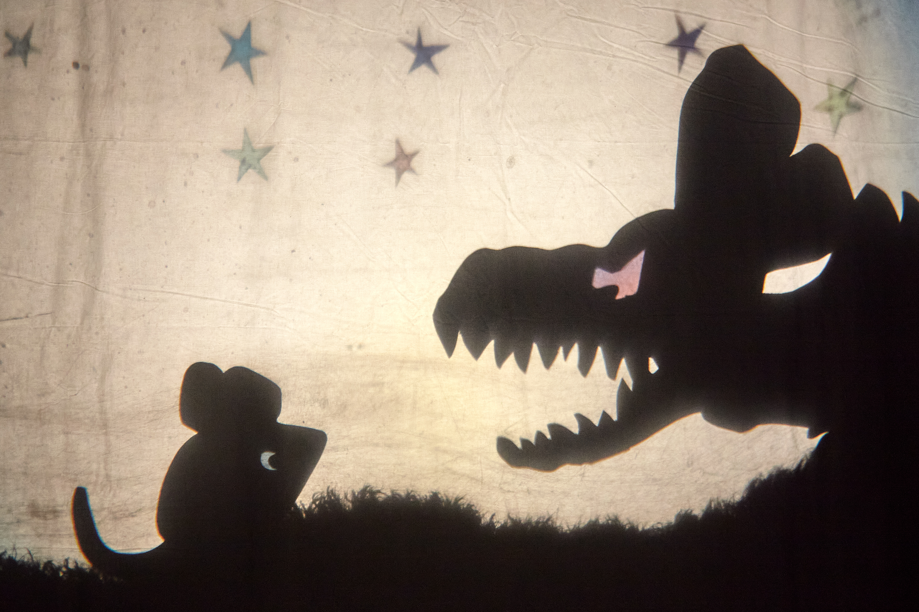Ideenreich beschreibt das Stück in der Regie von Pierre Schäfer den abenteuerlichen Weg zum Thron. Eine Puppenszene illustriert die Begegnung mit den Riesen: Da steht der nur etwa handgroße Hänfling unerschrocken den Ein-Meter-Kerlen gegenüber. Die Einhorngeschichte kommt als Schattenspiel daher. Und vom Sieg über das Wildschwein zeugt ein Borstenvieh-Kopf an der Wand. Eine Szene, in der Daniel Wagner (nicht nur Schau- und Puppenspieler, sondern auch Mitglied der Rock-Pop-Band Don Kopischke) sein musikalisches Faible beweist.