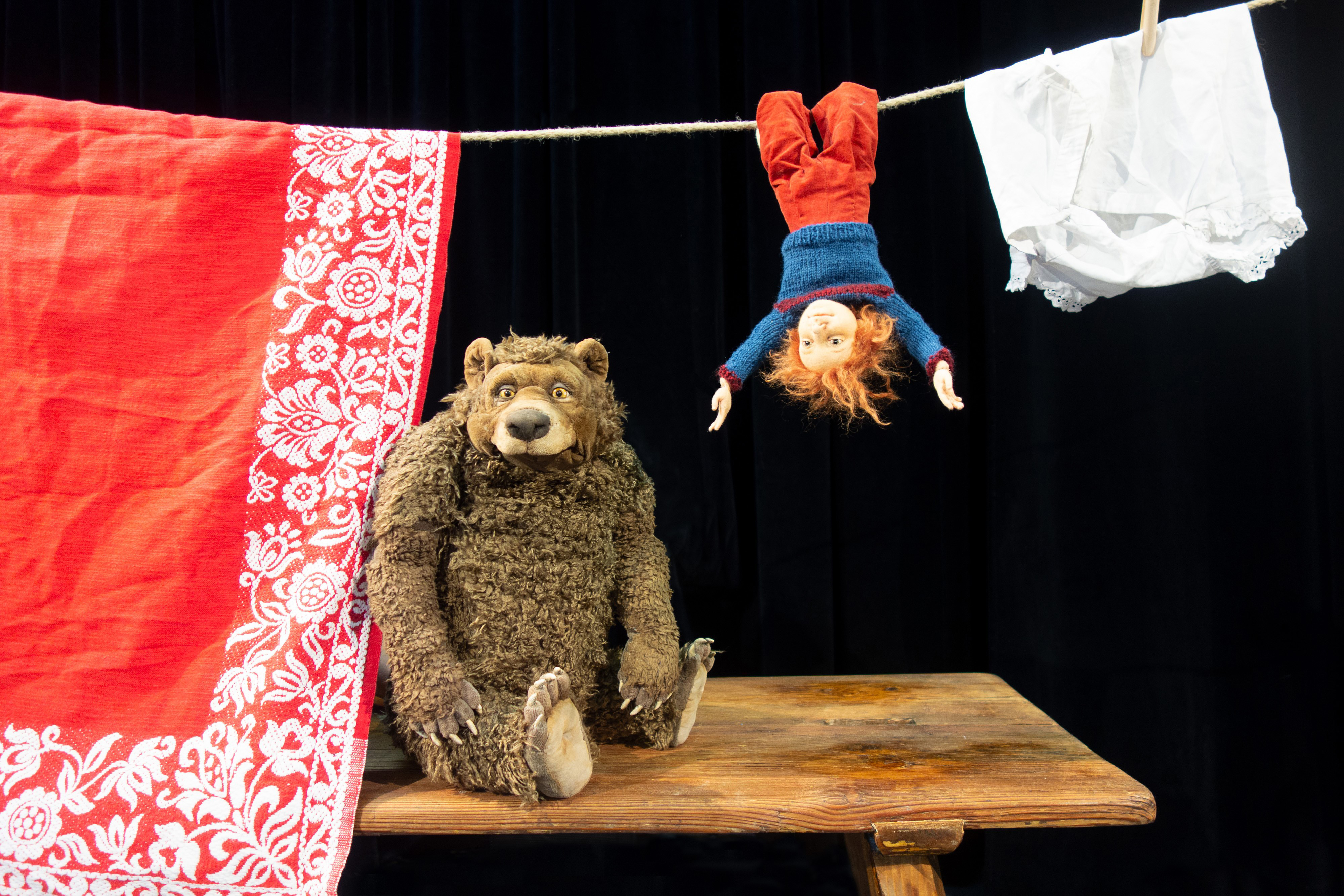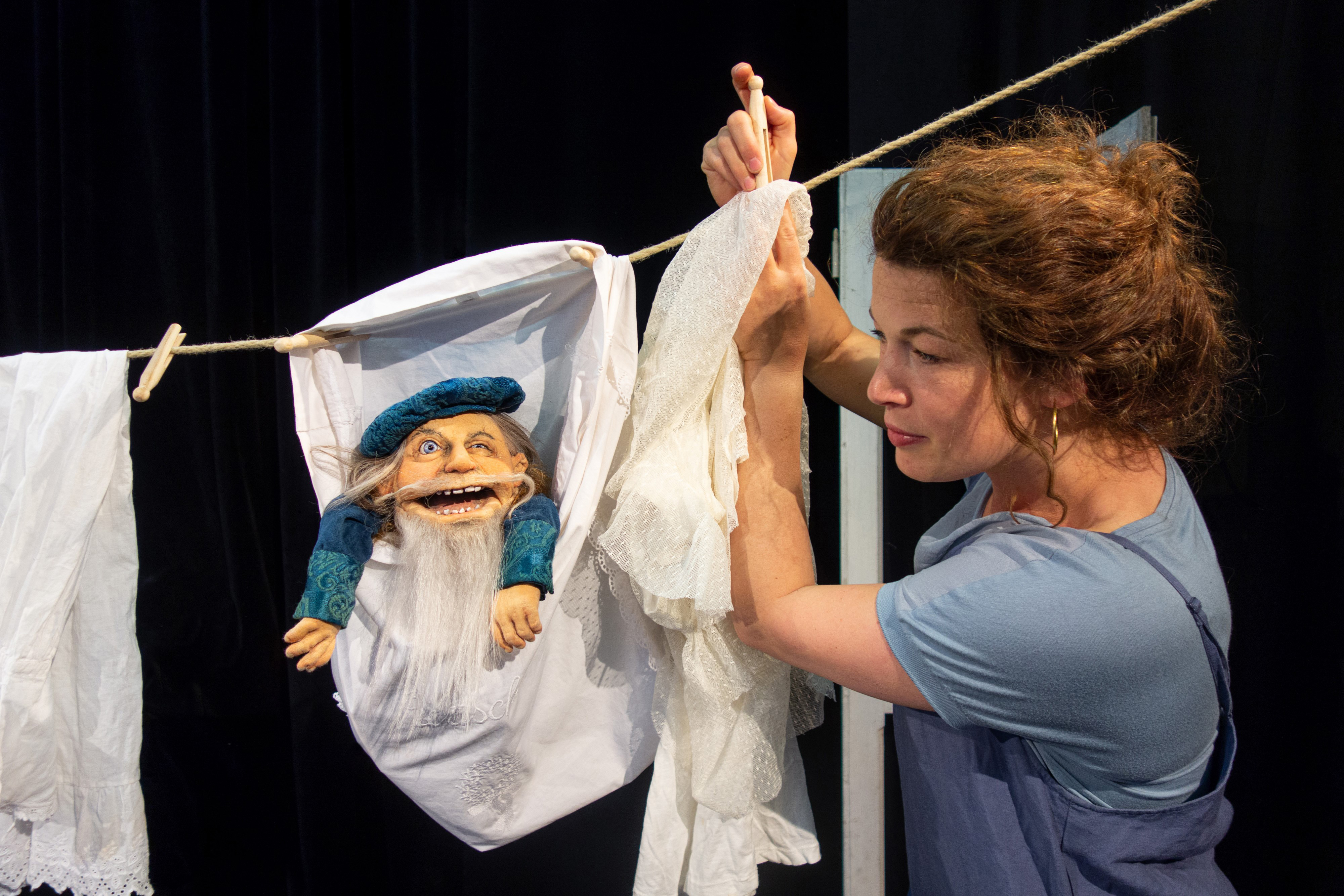 Ideenreich beschreibt das Stück in der Regie von Pierre Schäfer den abenteuerlichen Weg zum Thron. Eine Puppenszene illustriert die Begegnung mit den Riesen: Da steht der nur etwa handgroße Hänfling unerschrocken den Ein-Meter-Kerlen gegenüber. Die Einhorngeschichte kommt als Schattenspiel daher. Und vom Sieg über das Wildschwein zeugt ein Borstenvieh-Kopf an der Wand. Eine Szene, in der Daniel Wagner (nicht nur Schau- und Puppenspieler, sondern auch Mitglied der Rock-Pop-Band Don Kopischke) sein musikalisches Faible beweist.